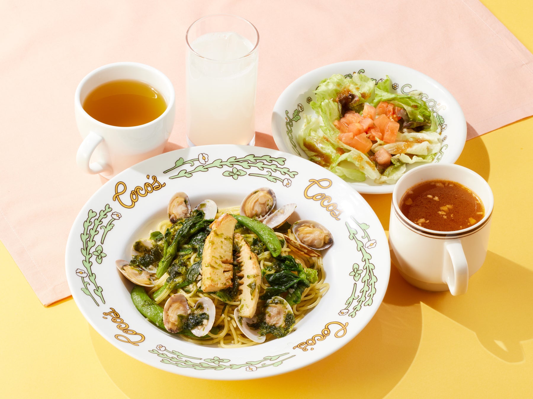 ココスこだわりの本格パスタにサラダ・ドリンクバー・スープバーが付いたお得なセットです。