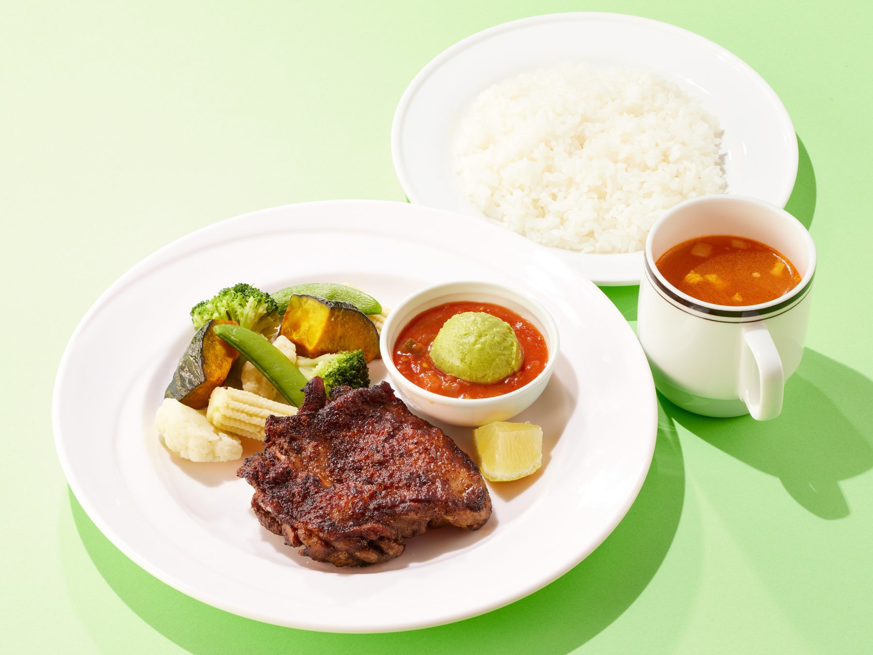 スパイスに漬け込んだチキンステーキを丁寧に焼き上げた一品です。香りも味もスパイシーでジューシーなチキンステーキと、たっぷりの温野菜を、付け添えのサルサソースやガッカモーレにディップしながらお召し上がりください。ライス大盛無料です。