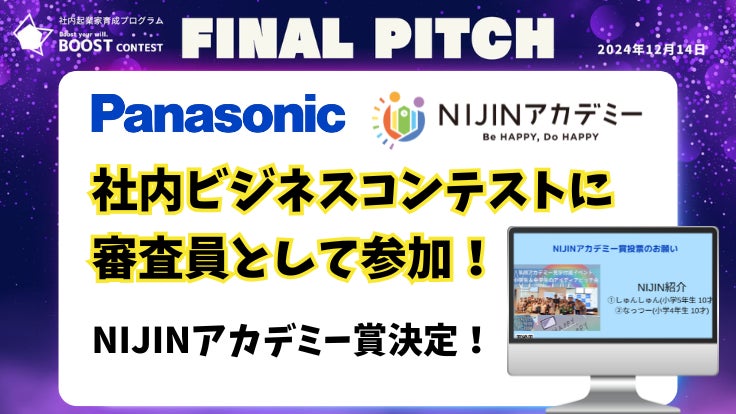 株式会社NIJIN(本社:東京都江東区、代表取締役:星野達郎)が運営する不登校オルタナティブスクール『NIJINアカデミー』の児童生徒が2024年12月14日にパナソニックホールディングスの社内起業家プログラムBOOST CONTESTに特別審査員として参加しました。
