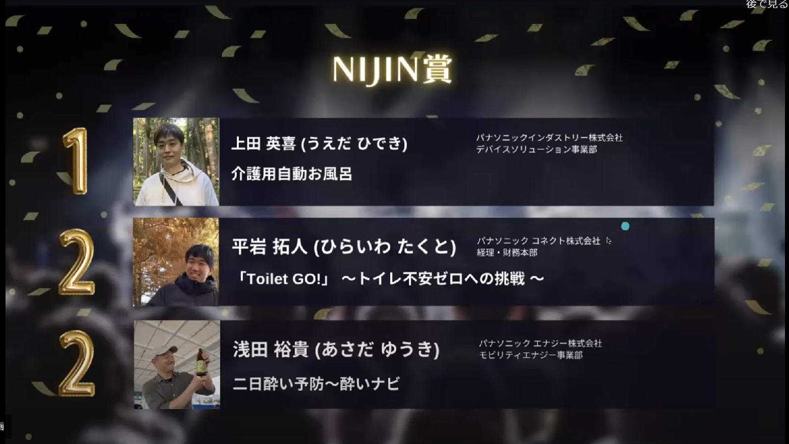 NIJINアカデミーの小中学生が選んだグランプリは、介護用自動お風呂の新規事業を発表した社員さんです。