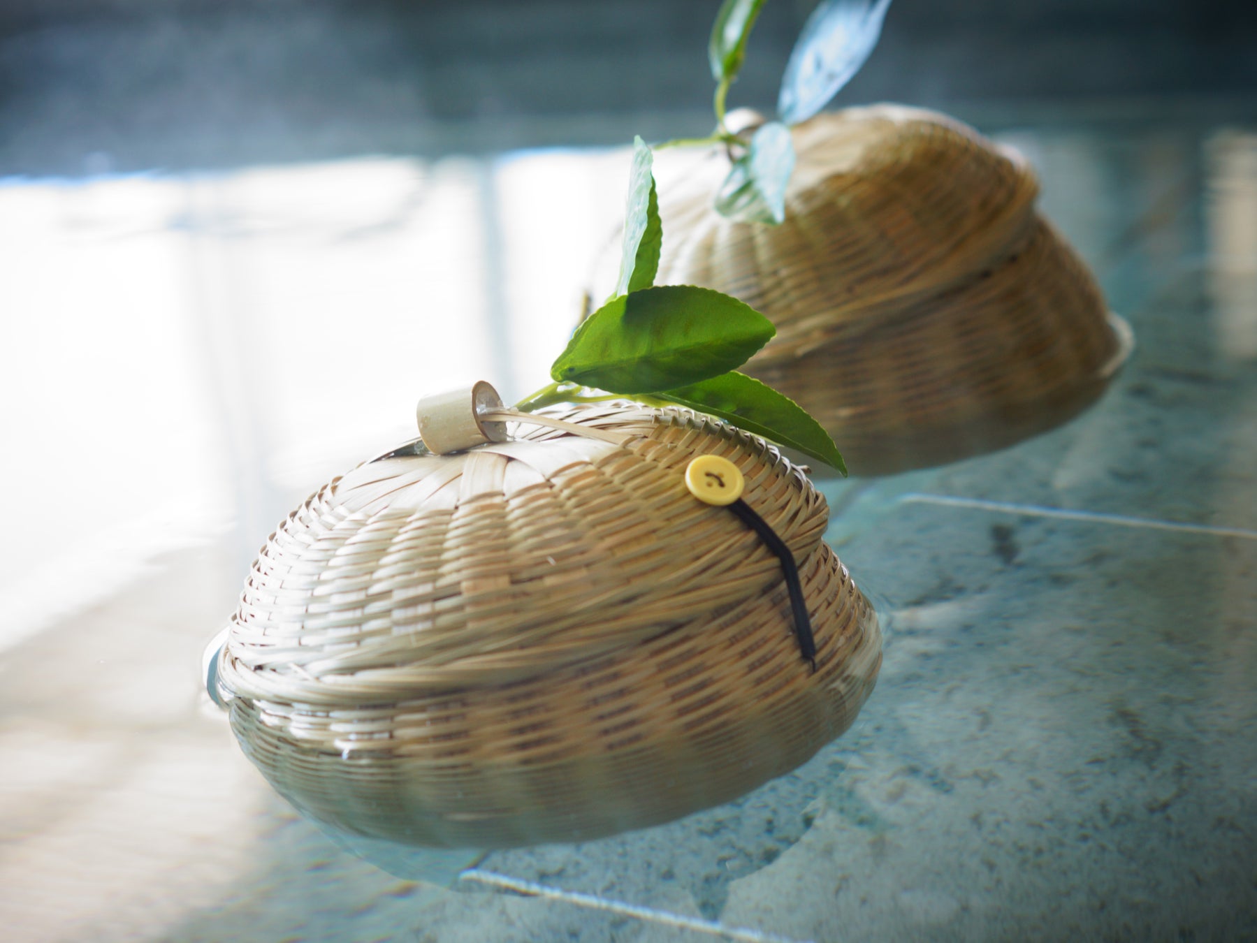 みかん湯というといくつも丸ごと湯舟に浮かべているところを想像するかと思います。丸ごと湯舟に浮かべると食べることなく廃棄となるためフードロスになってしまいます。そこではなをりでは、過去に農作物生産者と旅館でできる環境づくりで協力してきました小田原市の農園・あきさわ園に相談したところ、年始にジュースに加工する過程ででるみかんの廃棄する皮があることを知り、これを譲り受け、天日干し後、陰干しで保管し2月にご提供することにしました。ただ、みかんの皮を網に入れ湯舟に浮かべるのでは味気ないため、みかんに見立てた蓋付のかごに入れ湯舟に浮かべます。本年は3日間だけですが来年以降はもっとご提供できる日を増やし、みかんの皮以外のフルーツなどもかわり湯にしていきたいと模索しております。はなをりでは今後もサステナブル を念頭に置いて、要所に遊び心の花をそえて、やすらぎの生まれる空間をご提供できるよう取り組んで参ります。