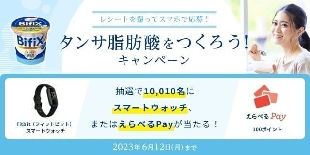 タンサ脂肪酸に興味をもち、生活に取り入れていただけるよう、「BifiXヨーグルト」を購入したレシートを撮影してスマホのキャンペーンサイトから応募すると、抽選で「えらべるPay」100ポイント分やスマートウォッチが当たるキャンペーンを実施中です。詳細はキャンペーンサイトをご確認ください。