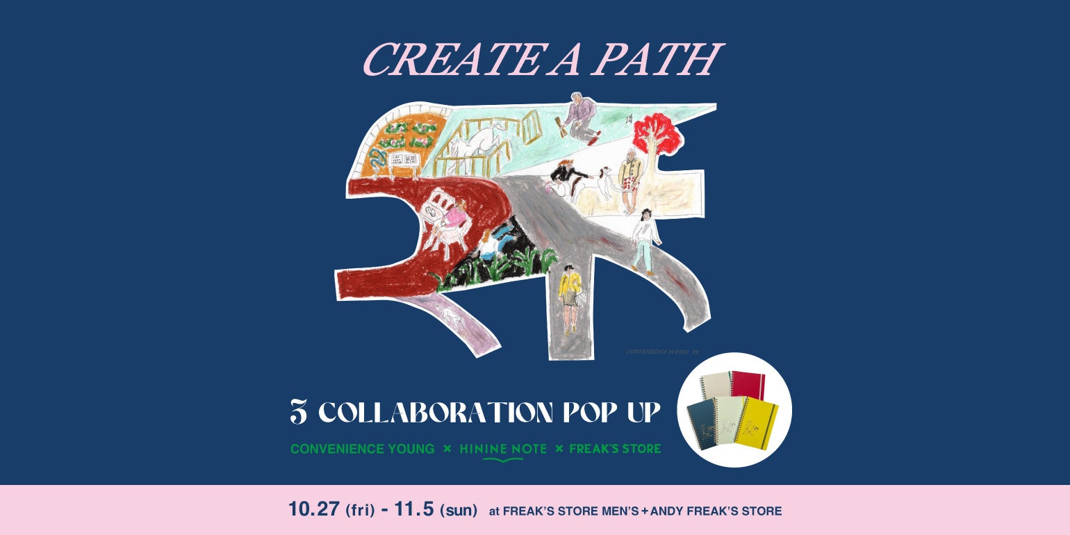 ”CREATE A PATH“ をテーマとしたCONVENIENCE YOUNG描き下ろしアートにくわえ、 CONVENIENCE YOUNG × FREAK‘S STOREのアパレルアイテム、HININE NOTE × convenience young × FREAK’S STOREによるコラボノートをPOP UP限定で販売いたします。