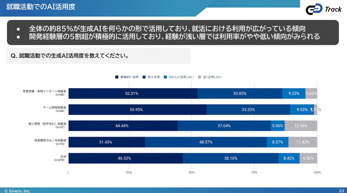 生成AI・AIエージェントの開発/コンサルティングおよびデジタル組織の構築を支援するHCMプラットフォーム「Track(トラック)」を展開する株式会社ギブリー(本社︰東京都渋谷区、代表︰井手 高志、以下、当社)は、生成AIの普及やジョブ型雇用の浸透により、エンジニア採用の難易度と複雑性が増す中、2026年卒業予定のエンジニア職志望学生279名を対象に、就職活動に関する実態調査を実施いたしました。