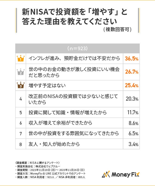 新NISAで投資額を増やす理由は、「インフレが進み、預貯金だけでは不安だから」(36.5%)が最も多く、「世の中のお金の動きが激しく投資にいい機会だと思ったから」(26.7%)と続きました。