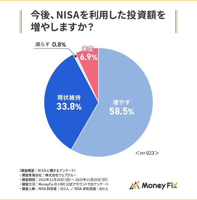 今後、NISAを利用した投資額を増やすかについては、58.5%の人が「増やす」と回答しました。「減らす」と回答した人は0.8%にとどまっています。