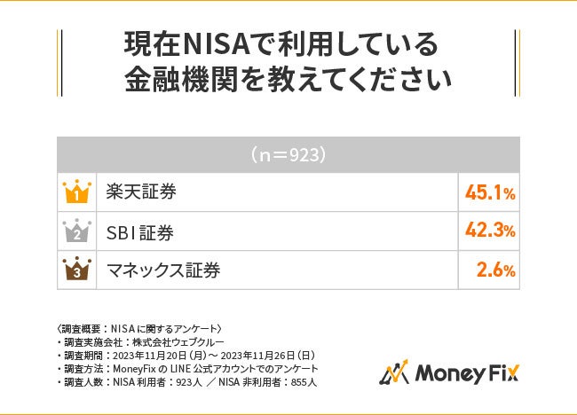NISAの金融機関、1位「楽天証券」(45.1%)、2位「SBI証券」(42.3%)と圧倒的