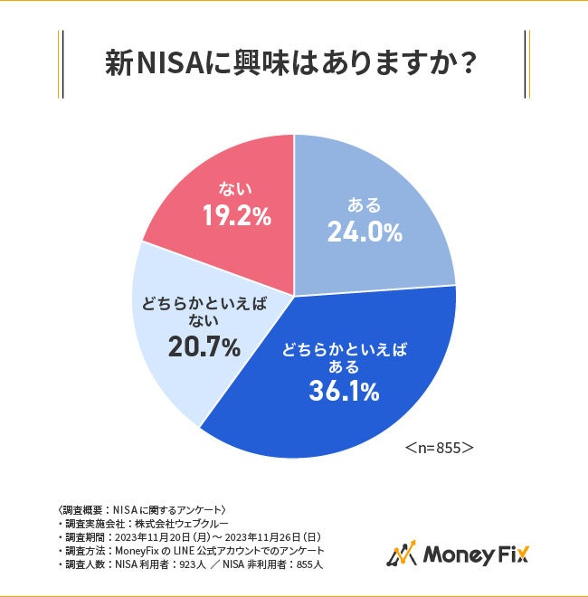 新NISAに興味があるかについては、「ある」(24.0%)、「どちらかといえばある」(36.1%)という結果でした。NISAを利用していない人のうち、6割の人は、新NISAに興味を持っていることがわかります。