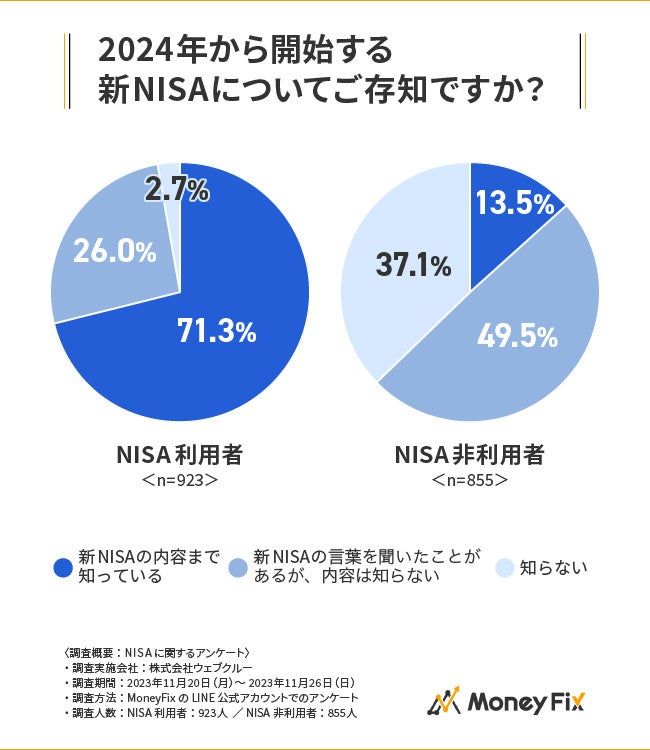 新NISAの認知度、NISA利用者で71.3%、NISA非利用者で13.5%と大きな差