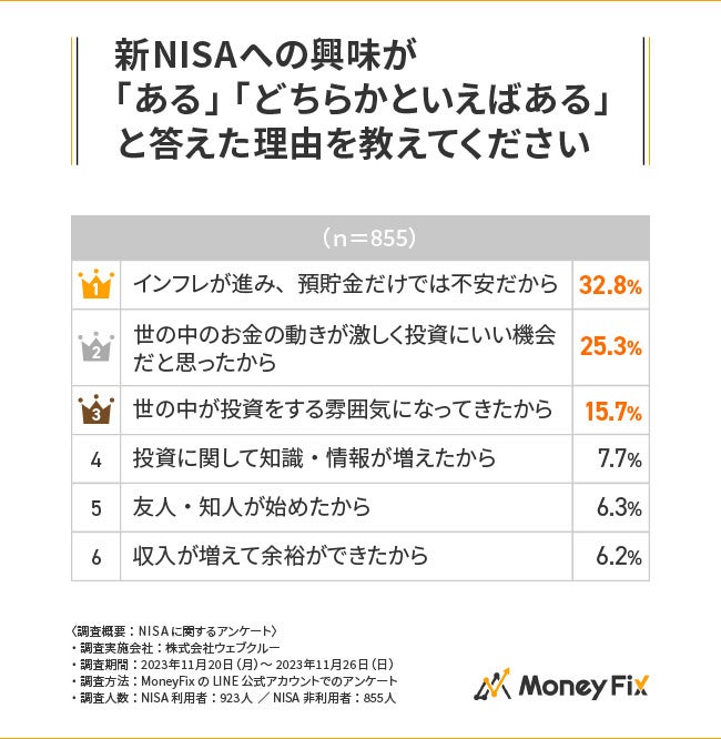 新NISAに興味がある理由については、「インフレが進み、預貯金だけでは不安だから」(32.8%)が最も多く、「世の中のお金の動きが激しく投資にいい機会だと思ったから」(25.3%)、「世の中が投資をする雰囲気になってきたから」(15.7%)と続きました。