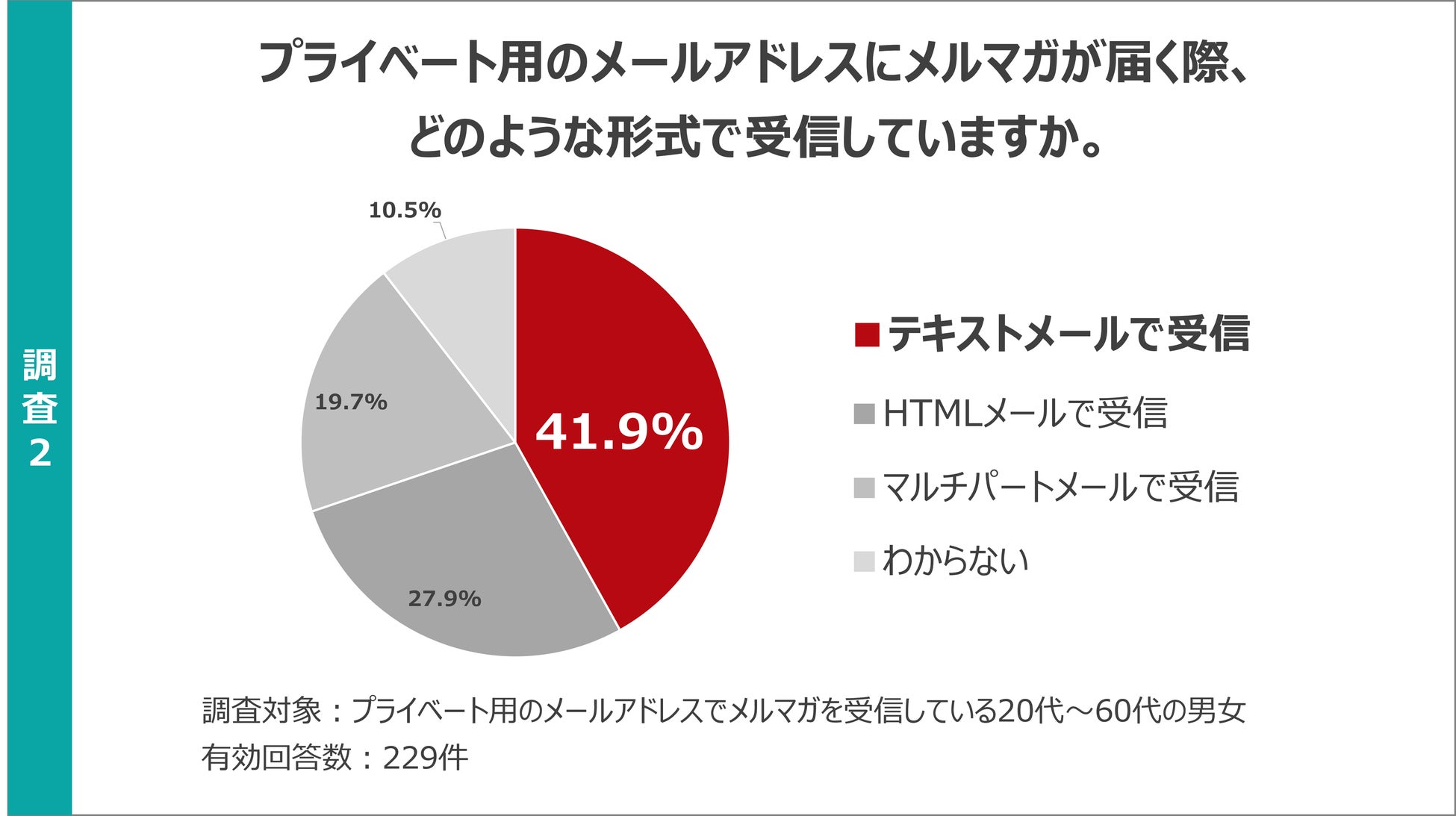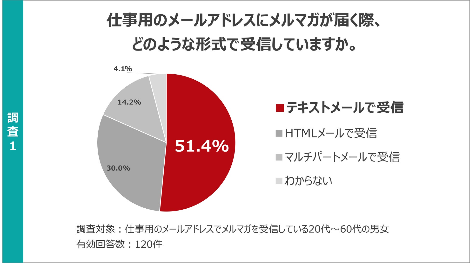 受信者側はテキストメール(文字のみ表示される形式)での受信が多く、送信者側はHTMLメール(文字に加え、画像や色付き文字なども表示される形式)での配信が多い傾向がある