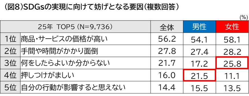 「SDGsの実現に向けて、行動を変えたり、商品・サービスを購入したりすることを妨げる要因」を聞いたところ、最も多かった回答は「商品・サービスの価格が高い」56.2%、次いで「手間や時間がかかり面倒」27.8%となりました。この結果、生活者側が負担や手間を感じることが、行動を阻む要因となっていることが分かりました。また、男女別で見ると、女性は「何をしたらよいか分からない」(25.8%)、男性は「押しつけがましい」(21.5%)が多い結果となりました。(図8)