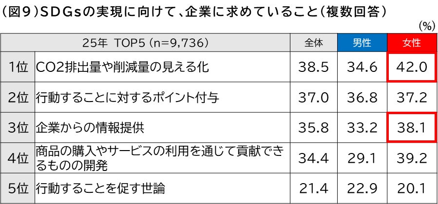 また、「SDGs実現に向けた行動を起こすために、企業はどのようなことをしたらいいと考えていますか」と聞いたところ、最も多かった回答は「CO2排出量や削減量の見える化」38.5%、次いで「行動に対するポイント付与」37.0%、「企業からの情報提供」35.8%となりました。男女別では女性の方が「CO₂排出量や削減量の見える化」(42%)や「企業からの情報提供」(38.1%)を重視する傾向が見られ、企業の情報開示や、商品・サービスを通じて貢献できる仕組みの提供が求められていることが分かりました。(図9)