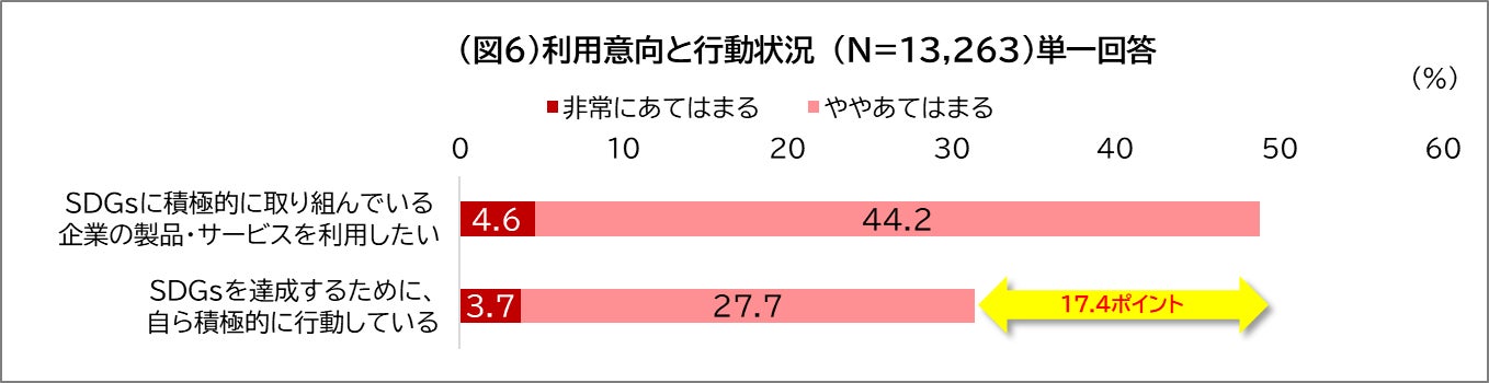 「SDGsに積極的に取り組んでいる企業の製品・サービスを利用したい(=利用意向)」にあてはまるか聞いたところ、48.8%があてはまると回答しました。一方、「SDGsを達成するために、自ら積極的に行動している」と回答した人は31.4%にとどまり、利用意向との差は17.4ポイントと大きなギャップが見られました。(図6)