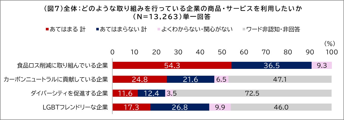 また、「どのような取り組みを行っている企業の商品・サービスを利用したいか」という質問に対しては、「食品ロス削減に取り組んでいる企業」を選んだ人が9割以上にのぼり、最も関心を集める結果となりました。(図7)