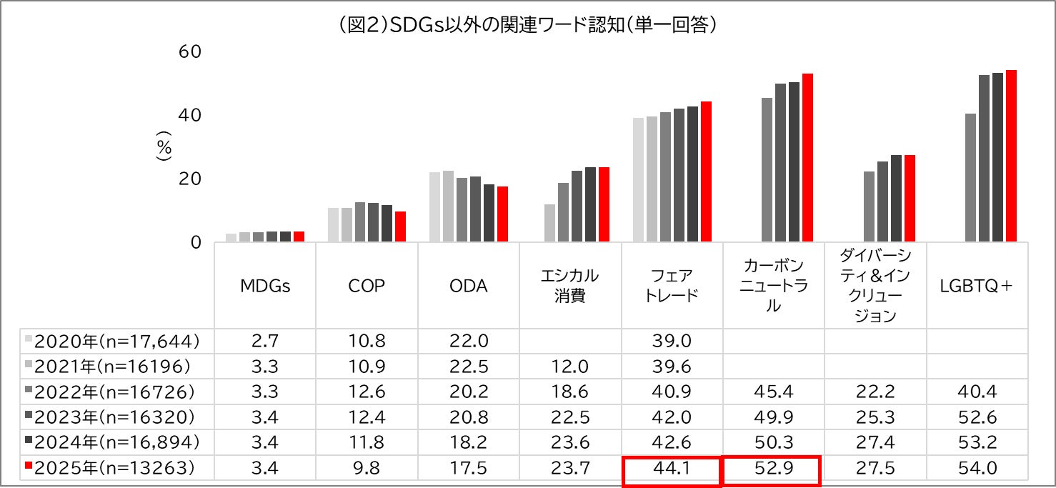 SDGs以外の関連ワード認知率を見ると、「フェアトレード」は1.5ポイント上昇して44.1%、「カーボンニュートラル」は2.6ポイント上昇して52.9%と、引き続き上昇傾向にある一方、その他の関連ワードでは上昇が鈍化していることが分かりました。(図2)