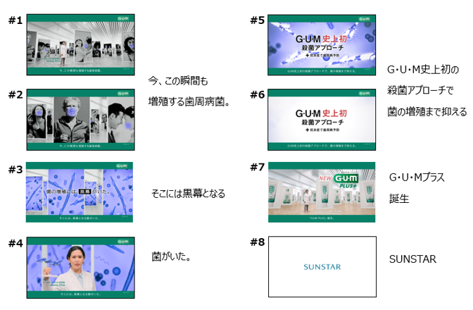 今回のCMでは、巨大なパネルで様々な生活者を投影しながら、生活者のお口の中で増殖する歯周病菌には黒幕となる菌がいることを伝えています。さらに、サンスターアメリカ(Sunstar Americas Inc.)で実際に研究員として働くジャーミー エリサ(Jeremy Elisa)がCMに登場し、新商品ガム・プラスが持つ機能であるガム史上初の殺菌アプローチで菌の増殖まで抑えることの重要性をCGなどを用いて表現しています。