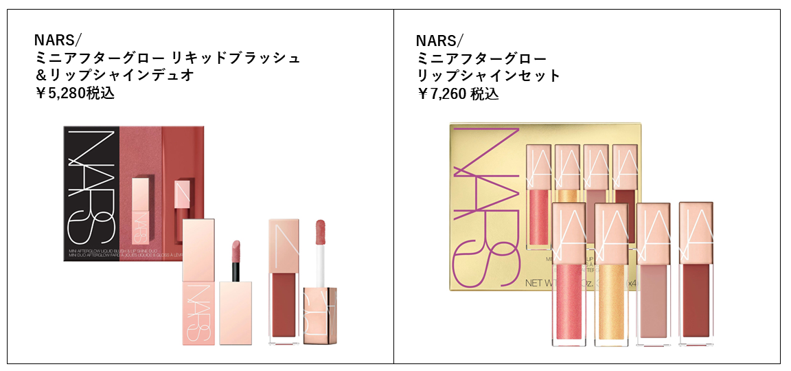 ベストセラーのNARSオーガズムコレクションより、ミニサイズの「アフタグロー リキッドブラッシュ」と「アフターグローリップシャイン」がスペシャルなセットに。また「アフターグローリップシャイン」のミニサイズセットがギフトにも最適なゴールドのパッケージで限定発売となります。