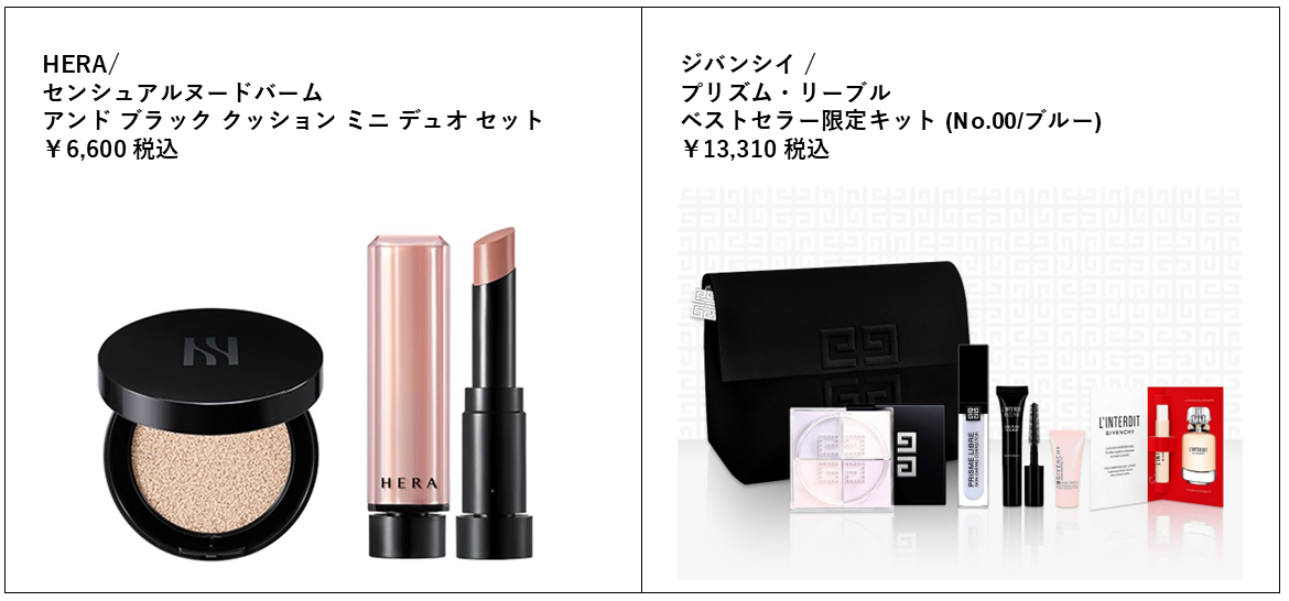 HERAの「センシュアルヌードバーム」の日本限定色#414MORNINGBEIGE(モーニングベージュ)」が、@cosme BEAUTY DAY限定で、人気のブラッククッションファンデーションのトライアルサイズとセットで登場。ジバンシイからは、ベストセラーの4色フェイスパウダー「プリズム・リーブル」No.00オパルセント・チュールと、同じくベストセラーのフェイスカラー「プリズム・リーブル・スキンケアリング・コレクター」ブルーの現品に、「ランテルディマスカラ」サンプルと「スキンPFCTUVフルイド」サンプル、「ランテルディオーデトワレ」1mL、「ブラックフラップポーチ」がセットになった@cosme BEAUTY DAY限定スぺシャルキットをご用意しました。
