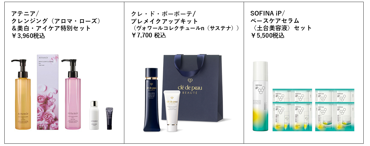 @cosmeベストコスメアワード2024 上半期新作ベストコスメ総合大賞を受賞したアテニアの「スキンクリア クレンズ オイル」のアロマタイプとローズリュクス(限定デザイン)の現品がセットになった特別なセットや、@cosmeベストコスメアワード2023 ベスト化粧下地 第1位を受賞したクレ・ド・ポーポーテの、小じわやくすみをカバーしてワントーン明るい肌に仕上げる化粧下地「ヴォワールコレクチュールn」と洗顔フォーム「ムースネトワイアントA n」のセットなどがラインナップ。さらに、@cosmeベストコスメアワード2024 上半期新作ベストコスメ総合第6位受賞のSOFINA iP「 ベースケア セラム〈土台美容液〉」現品と基礎化粧液・深夜浸透クリームのサンプルがセットになったお得なセットも登場。