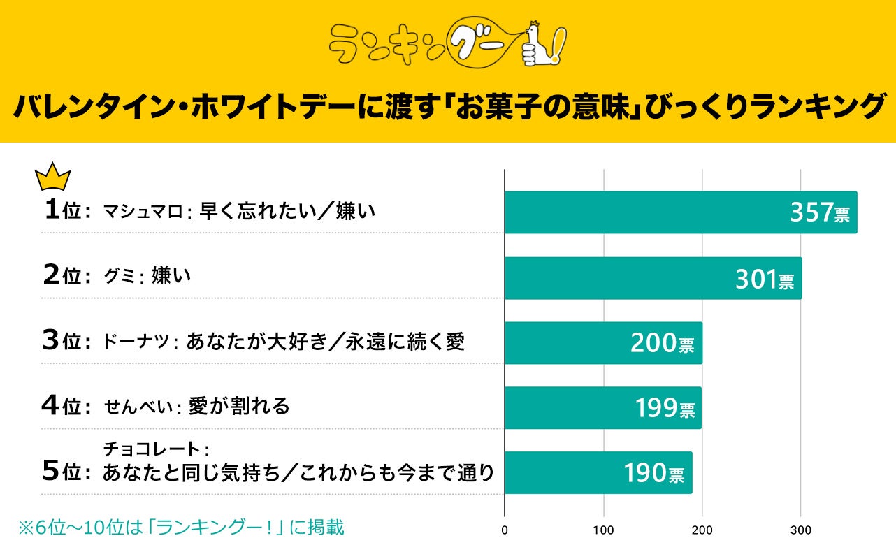 1位は『マシュマロ:早く忘れたい/嫌い』に決定!2位は『グミ:嫌い』。3位は『ドーナツ:あなたが大好き/永遠に続く愛』。1票差で4位は『せんべい:愛が割れる』。9票差で5位は『チョコレート:あなたと同じ気持ち/これからも今まで通り』という結果になりました!