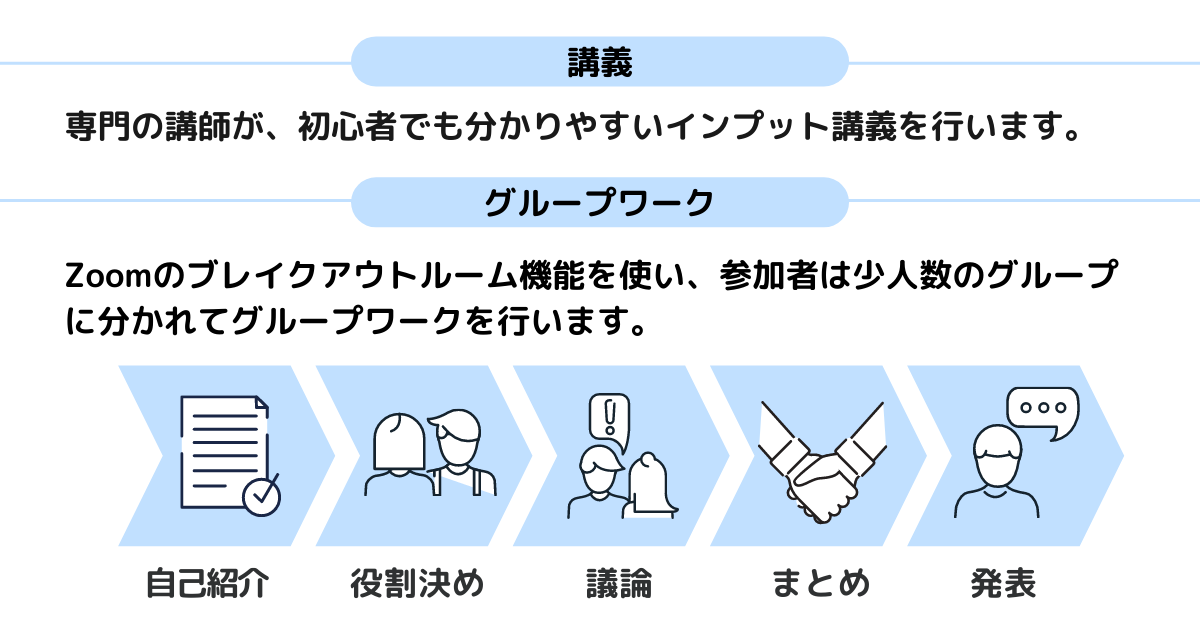 オンラインでの開催ではありましたが、講師による講義だけでなくグループワークを取り入れることで、参加者同士の交流が生まれ、よりリアルに近い体験を生み出すことができました。