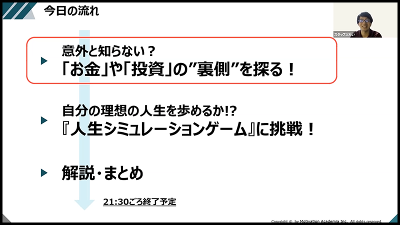 ◇投資のやり方など、身の回りでは学べないことを多く学べたので良かったです。それに、このコロナ禍でほかの人と話をしながら考えるのが久しぶりだったので、貴重な体験をしました。ありがとうございます。