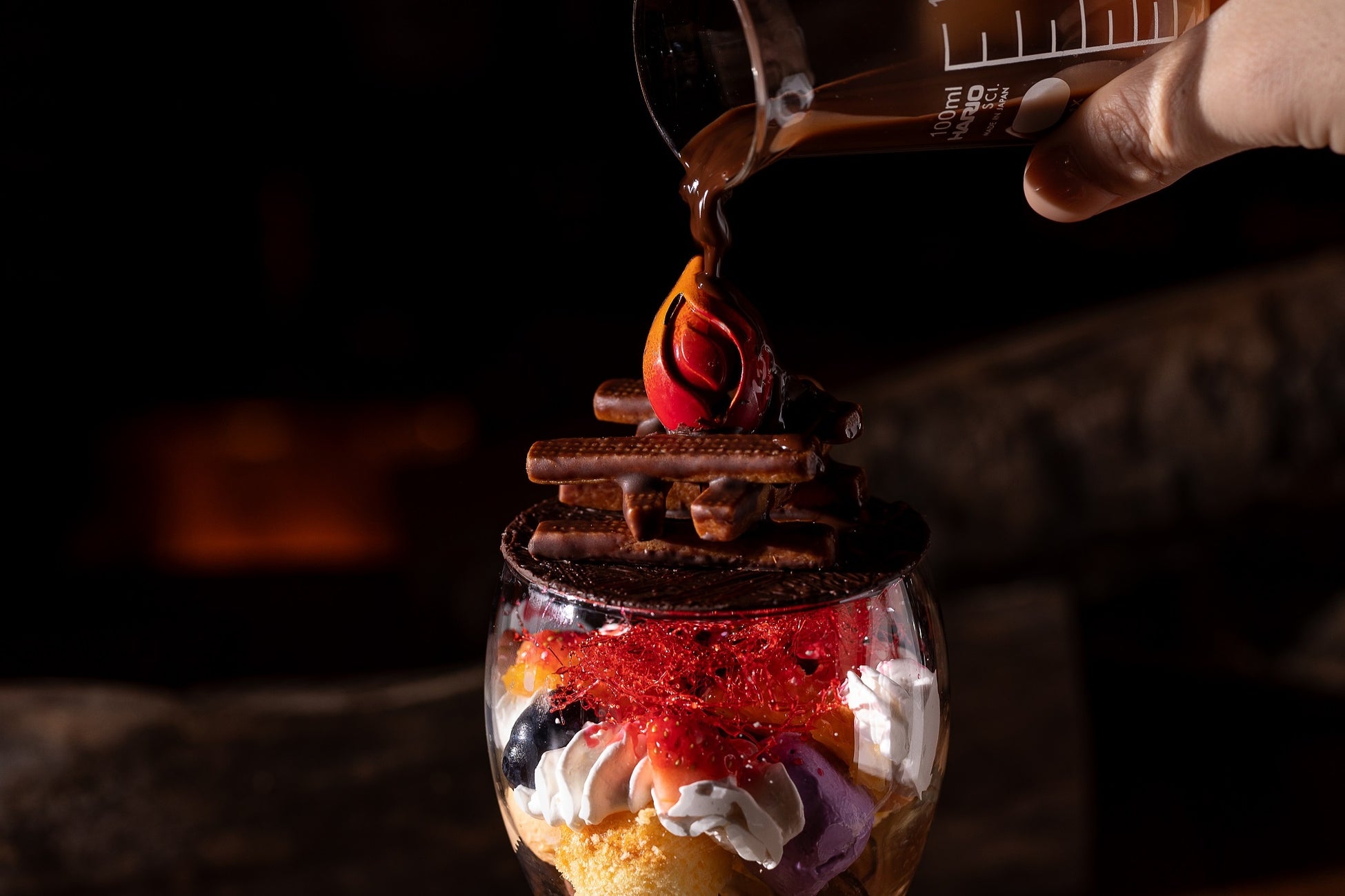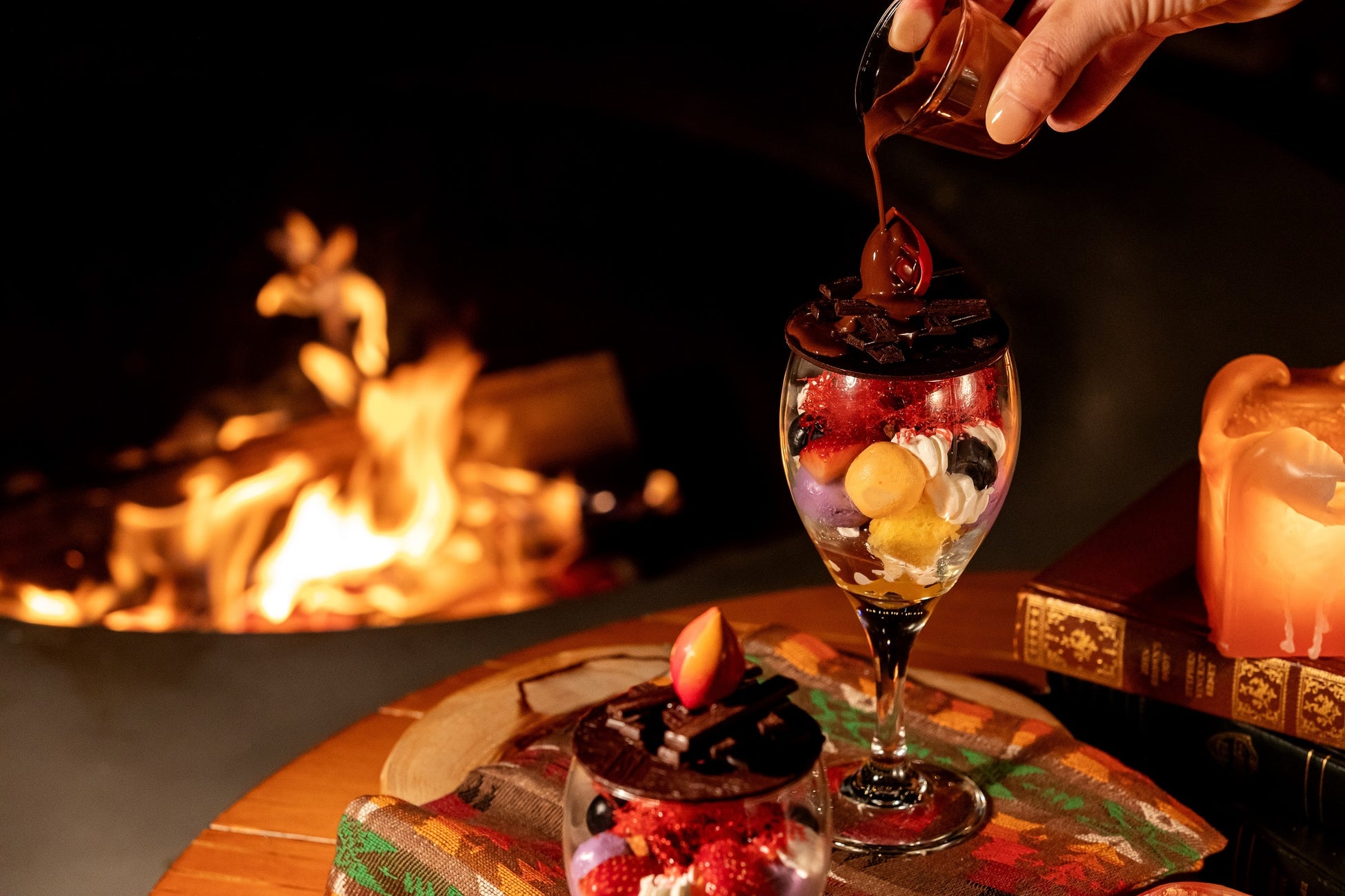 「UNWIND Takibi Parfait」のトップには、大きな焚き火をモチーフにした炎の形のチョコレートと薪を表したクッキーをトッピングしました。グラスの中にはビターオレンジゼリーとホワイトチョコレートとバニラを使用した濃厚なクリームで大人な甘さを表現し、フルーツとヨーグルトのアイスクリームを入れ、食感のアクセントにカカオニブと炎をイメージした飴細工を使用し、一つのグラスに組み合わされた様々な素材の味わいと食感をご堪能いただけます。ダークラムの芳醇な香りを纏った熱々のチョコレートソースをかけて、グラスの中にゆっくりと広がってゆくチョコレートの香りお楽しみください。