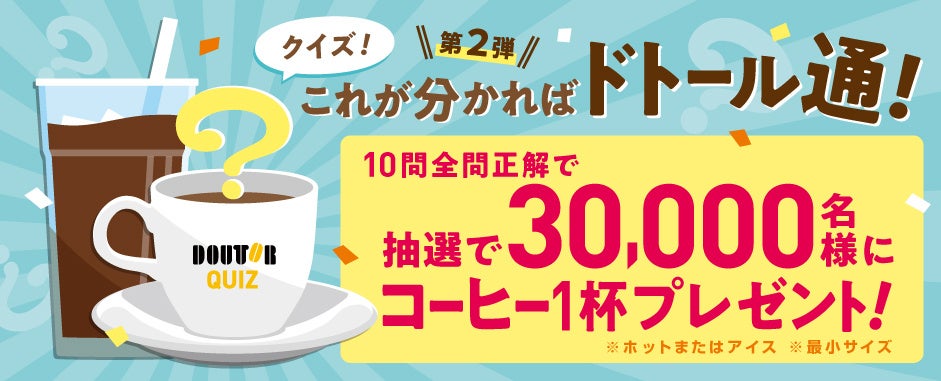 ドトールグループに関するクイズに解答し、10問全問正解すると抽選で期間合計30,000名様に、コーヒー1杯引き換え券(最小サイズ)をプレゼントします。