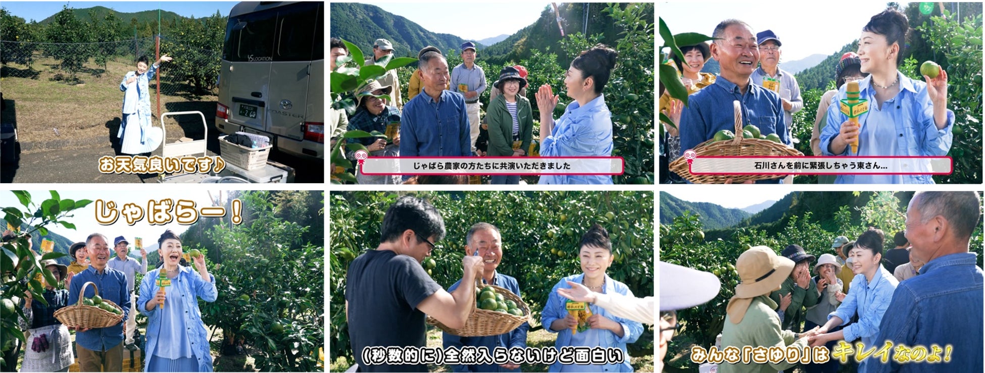 ロケ地は、和歌山県北山村のじゃばら農園。山に囲まれた場所なので天気が心配でしたが、雲ひとつない快晴に!晴れを呼び寄せる石川さんパワーをお借りしつつ、撮影スタート!…とはいえ、今回出演いただいた農家の方々は役者ではなく、本当のじゃばら農園の方々。石川さんを前に緊張で笑顔が固くなってしまう場面もありましたが、石川さんの「じゃばら〜♪」コールで現場は一気に和やかムードに。みなさんの緊張もすっかり解けたようで、撮影は順調に進んでいきました。撮影終了後には、石川さんと同じ「さゆり」というお名前の方がいることが判明!さゆりトークも飛び出し、最後まで笑いの絶えない現場となりました。