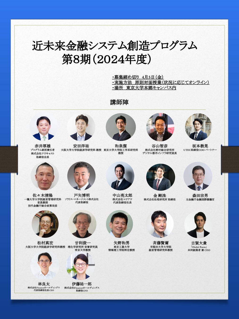 本プログラムは、実体経済と金融の関わり、資本主義における金融の役割、技術と金融の融合について理解するだけでなく、近未来の金融システムにおいて各参加者が果たす役割を具体的に構想しアクションにつなげることを後押しする、理論と実践の融合を狙ったオムニバス形式の講義プログラムです。講師には各分野の最先端で活躍する日本を代表する研究者や実務家を起用し、それぞれの分野の空気に触れる機会を提供します。またプログラムの後半では、パネルディスカッションの形式を取り入れ、講師・受講者相互あるいは受講生間のネットワーキングも促進します。なお、今期の本プログラム参加者は東京大学工学部と東京大学大学院工学系研究科において単位認定される共通講義「近未来金融システムの創成」における「指定討論者」として講義に協力することとなります。また、本プログラムは、2022年に発足した東京大学大学院工学系研究科「メタバース工学部」の登録科目となっており、同学部の法人メンバーから選抜された受講生向けに講義を行います。