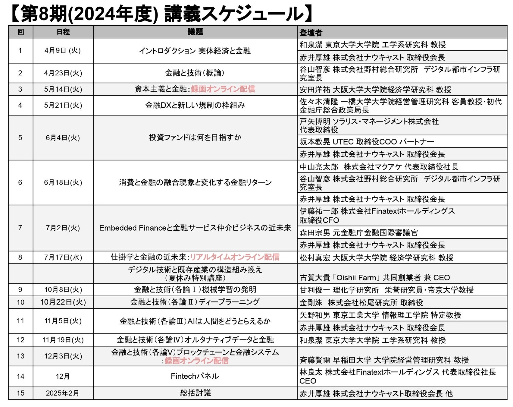 全15回のうち、第1~13回(東京大学の「近未来金融システムの創生」への指定討論者として参加)は50名。ただし、第1回は、指定討論者向けのガイダンスとして大学講義とは別で実施することがある。2025年2月の最終回(第15回)は別途追加募集する。
