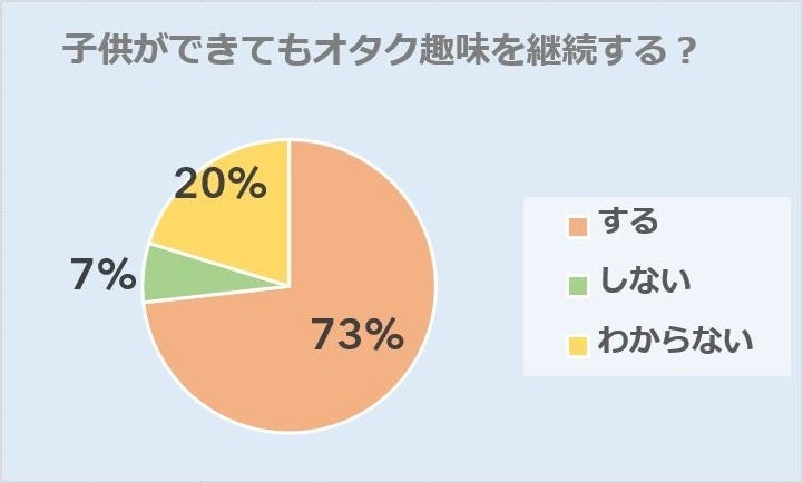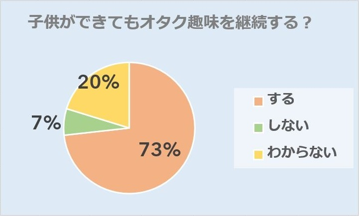 また子供ができてもオタク趣味を継続するという人が73%、かつ子供と一緒にオタク趣味を楽しみたくないという人も18%いるなど、子育てを気にせず自分の趣味を邪魔されたくないと考える層も一定数いることがわかりましたが、最終的には7割がオタク活動継続の意思を持ち、「子供ができたらオタクをやめる」という方はとら婚フォロワーでは全体の2割の【少数派】であるという事が明らかになったといえます。