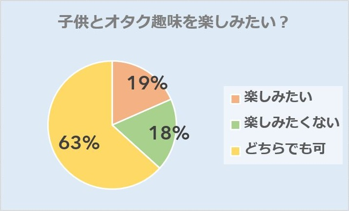 一方、自分の子供と一緒にオタク趣味を楽しみたいという質問では「楽しみたい」「どちらでも可」を合わせると約8割に達し、親子で同じ趣味を一緒に楽しむことに憧れを抱いている方が実は意外と多いということが判明しました。