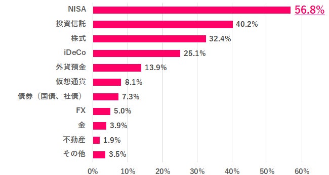 現在投資をしている人に、どんな投資をしているかを聞いてみると、1位「NISA」56.8%、2位「投資信託」40.2%、3位「株式」32.4%となりました。Q.2のこれから始めたい投資で4位だった「投資信託」が2位にランクイン。回答率も23.3%から40.2%へ倍増していることがわかります。
