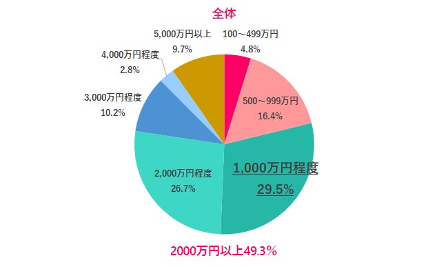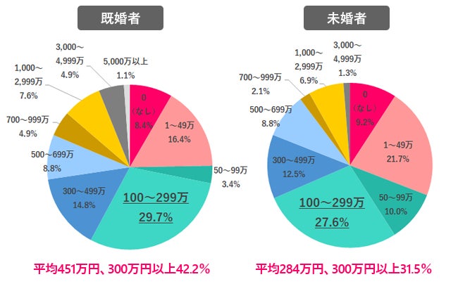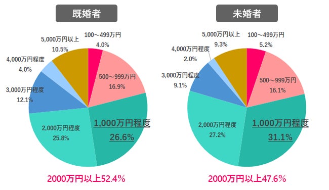 既婚者と未婚者を比較したところ大差はありませんでしたが、2000万円以上の回答をする人が既婚者の方がやや多い結果となりました。
