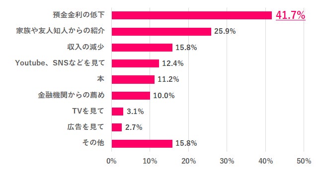 現在投資をしている人に、投資を始めたきっかけを聞いてみると、1位「預金金利の低下」41.7%、2位「家族や友人知人からの紹介」25.9%、3位「収入の減少」となりました。その他としては、「会社で自社株の購入を薦められた」「会社で説明会があった」などのコメントが目立ちました。