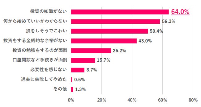 現在投資をしていない人に、投資をしていない理由を聞いてみると、1位「投資の知識がない」64.0%、2位「何から始めていいかわからない」58.3%、3位「損をしそうでこわい」50.4%となりました。投資に対する知識不足や不安感から投資に踏み切れない人が多いことがわかります。