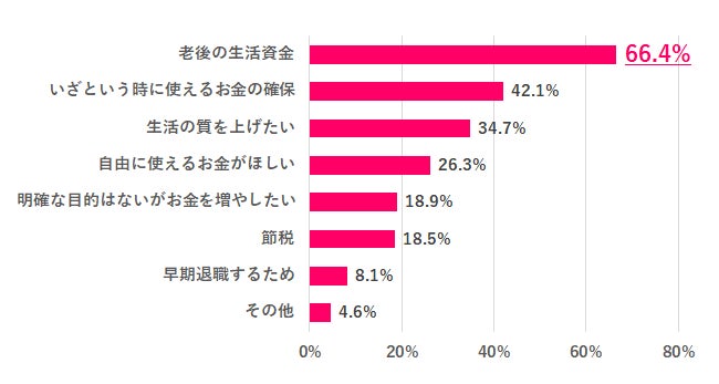 現在投資をしている人に、投資の目的を聞いてみると「老後の生活資金」66.4%が最も多い結果となりました。2位以降は、「いざという時に使えるお金の確保」42.1%、「生活の質を上げたい」34.7%、「自由に使えるお金がほしい」26.3%となっており、将来的な資産形成が主な目的であるものの、現在の生活のゆとりのために投資をしている人が多い傾向があることがわかります。