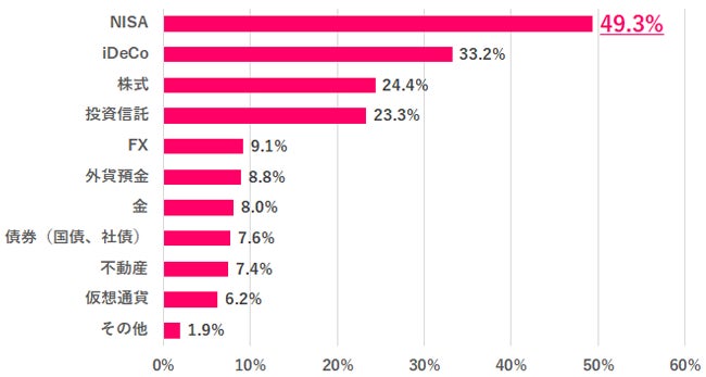 これから始めたい投資を聞いてみると、1位「NISA」49.3%、2位「iDeCo」33.2%、3位「株式」24.4%、4位が僅差で「投資信託」23.3%でした。税制優遇のメリットがあるものや、比較的リスクが少ないとされる投資への興味が高いことがわかります。
