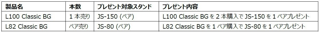 ✓L100 Classic BGは、2本での購入時のみスタンドのプレゼント対象になります。1本のみ購入の場合は対象となりません。L82 Classic BGはペア製品のため1セットのご購入でプレゼント対象になります