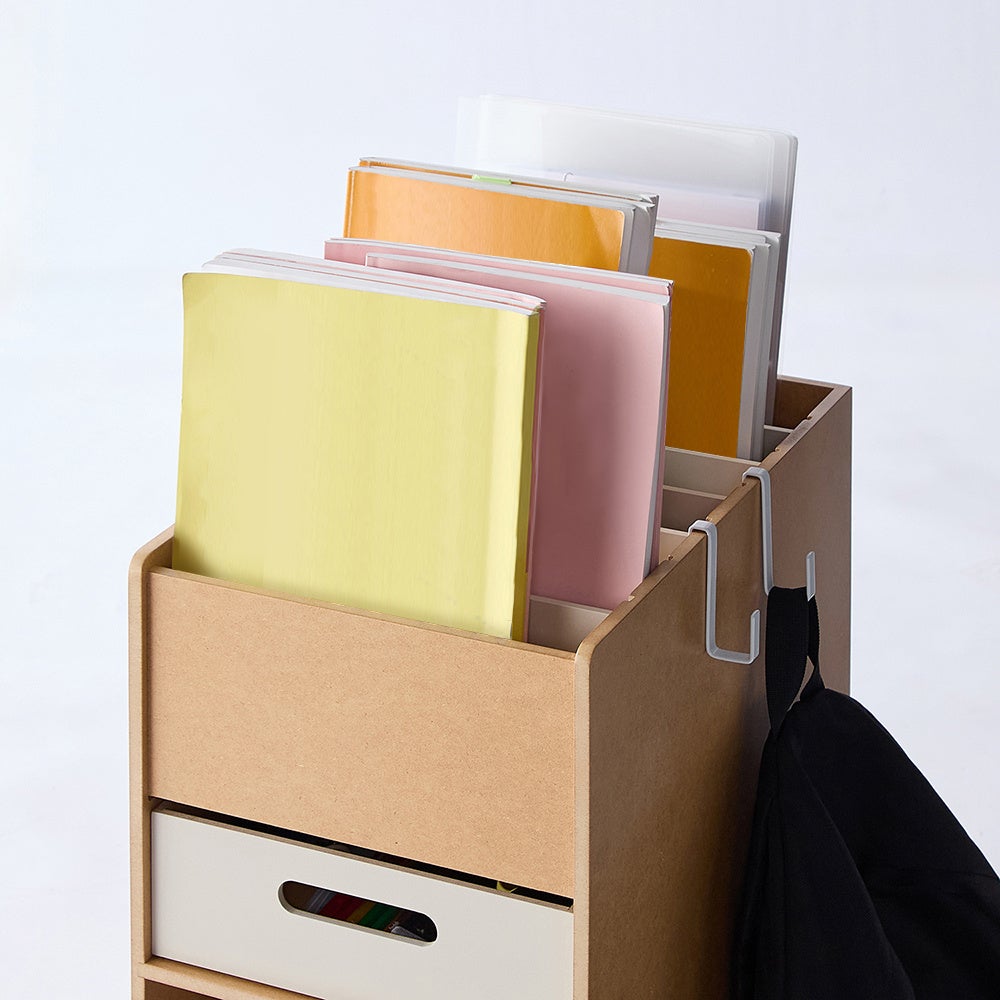 教材の表紙が見えるように立てて収納できるため、子どもが直感的に必要なものを取り出すことができ、「教材を探す」という無駄な時間と労力から解放されます。