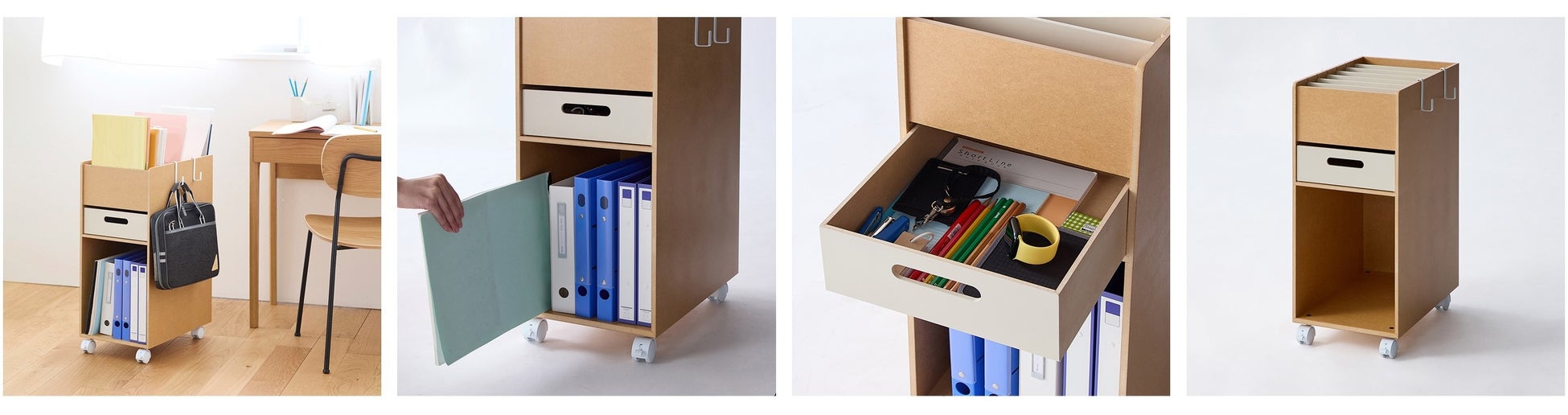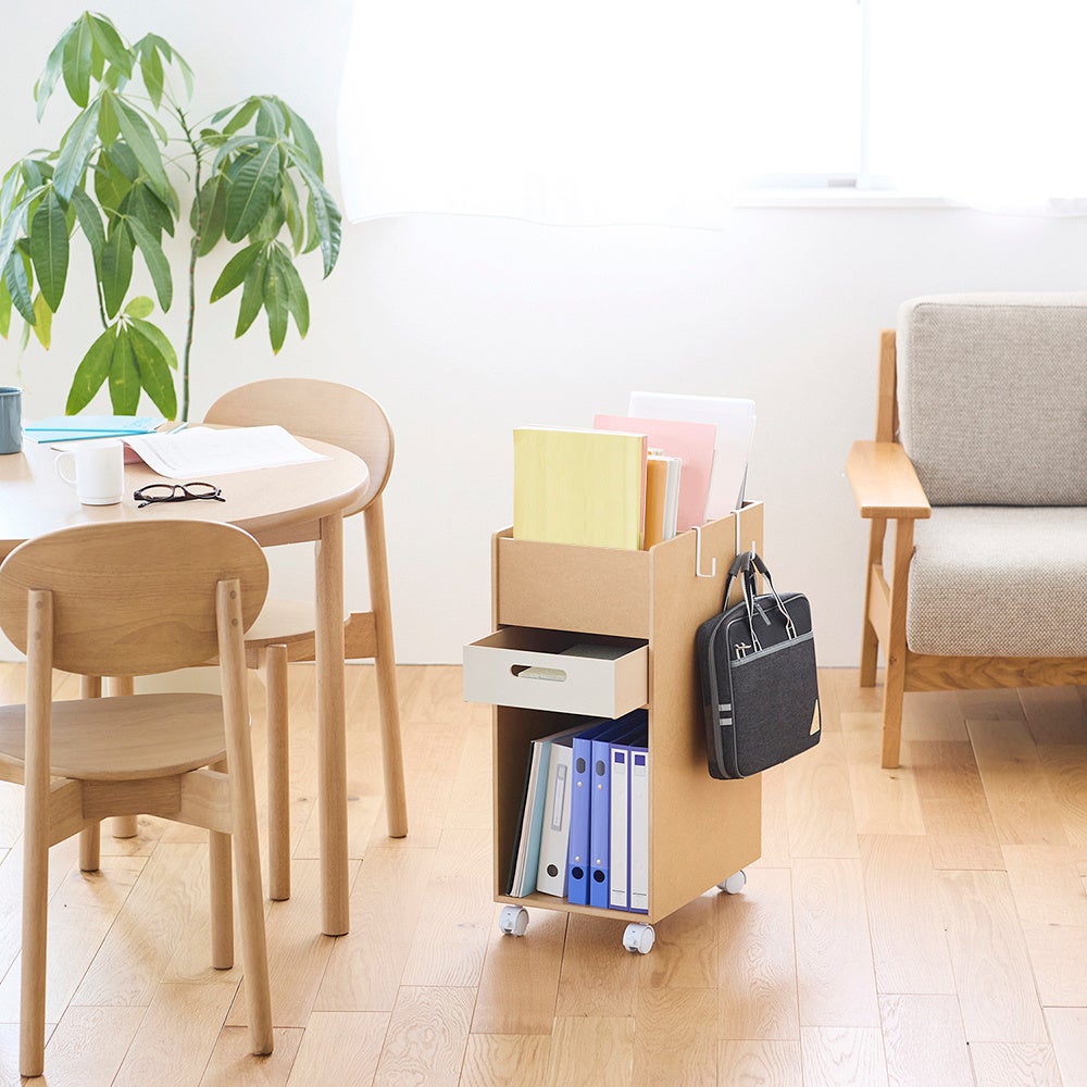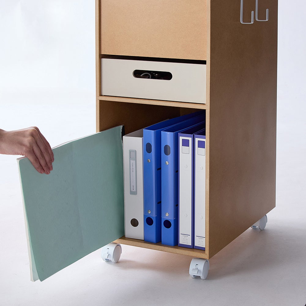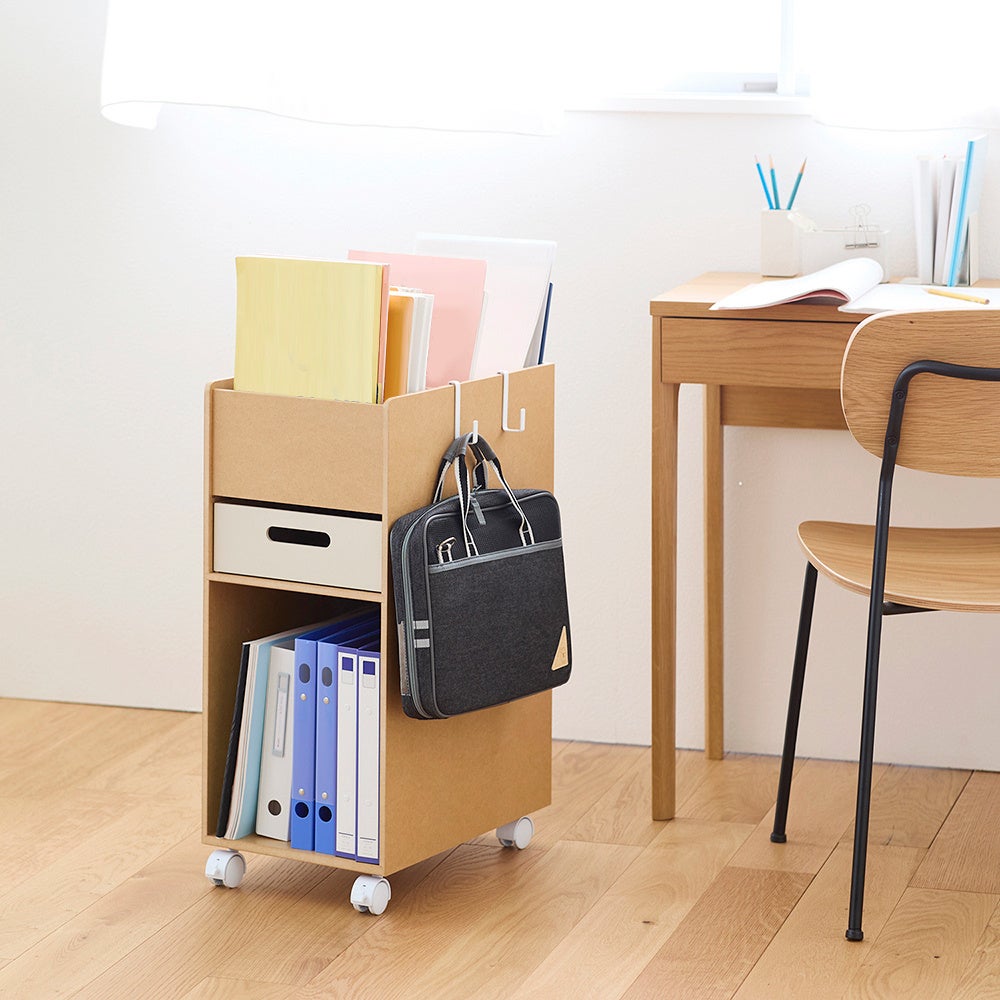 また、昨今ではリビング学習も当たり前になってきていることから、家族の憩いの場であるリビングに馴染むナチュラルな色合いであることや、勉強中だけ手元に引き寄せられるコンパクト設計やキャスターを採用し、新商品「受験サポートB4ファイルラック」が完成しました。