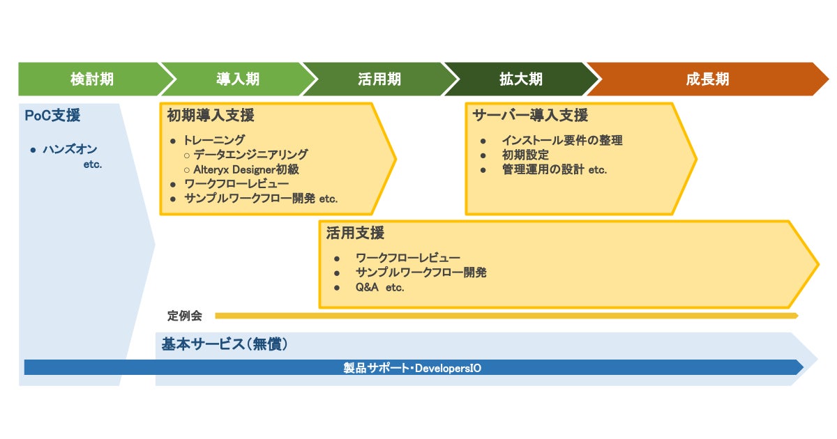 Alteryx技術支援パッケージは、Alteryxの導入から活用、さらに利用ユーザーを社内に拡大していく各フェーズにおいて必要なサポートをまとめて提供するサービスです。