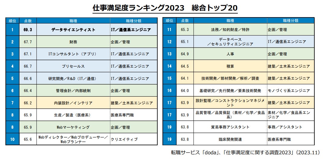 転職サービスdoda「仕事満足度ランキング2023」< https://doda.jp/guide/manzokudo/ >