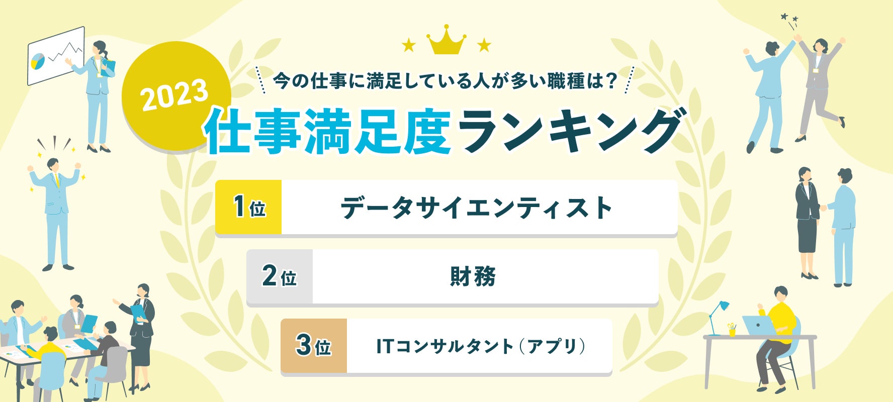 2023年の仕事満足度ランキング総合1位は「データサイエンティスト」でした。仕事満足度の点数が高かった回答者からは、その理由として「顧客の経営判断の一助となっている」、また「やりたいことができる」「自由度が高い」といった点が挙がりました。企業のDXがますます進む中で、はたらきがいや、自らが望む仕事に携われていることなどが満足度に寄与していると考えられます。