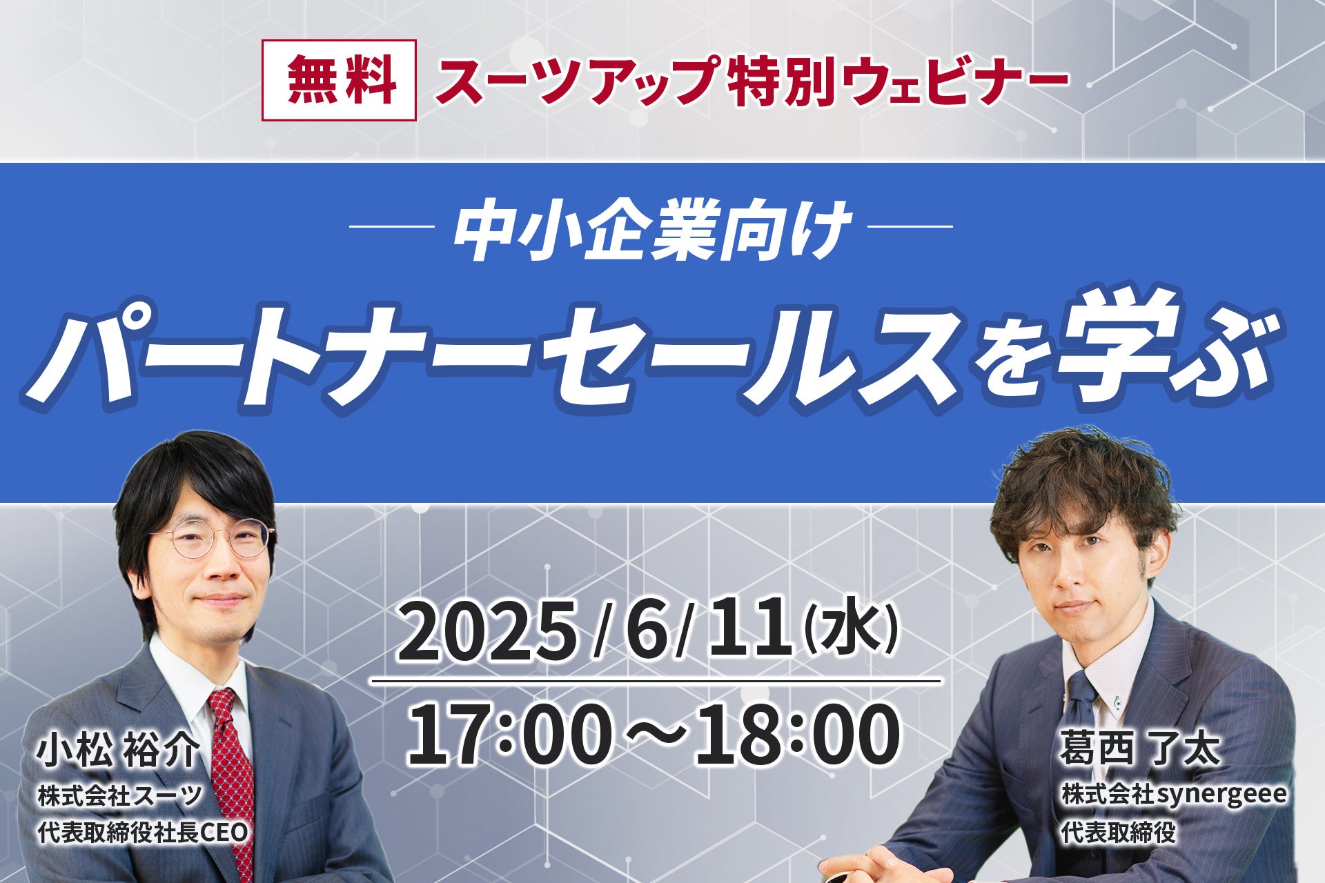 株式会社スーツ(所在地:東京都千代田区、代表取締役社長CEO:小松 裕介)は、2025年6月11日(水)17時から、ゲスト講師に、株式会社synergeee(パートナーセールス研究会) 代表取締役 葛西 了太氏を迎え、第10回となるスーツアップ特別ウェビナー「中小企業向け パートナーセールスを学ぶ」を無料開催します。