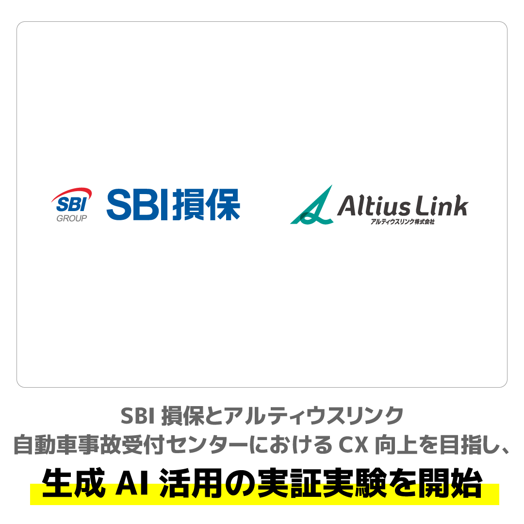 アルティウスリンク株式会社(所在地:東京都渋谷区、代表取締役社長:若槻 肇、以下「アルティウスリンク」)とSBI損害保険株式会社(本社:東京都港区、代表取締役社長:小野 尚、以下「SBI損保」)は、自動車事故受付センターにおける顧客体験(CX)向上を目的に、「Altius ONE for Support」※1を導入し、生成AIを活用した実証実験を共同で開始いたしました。
