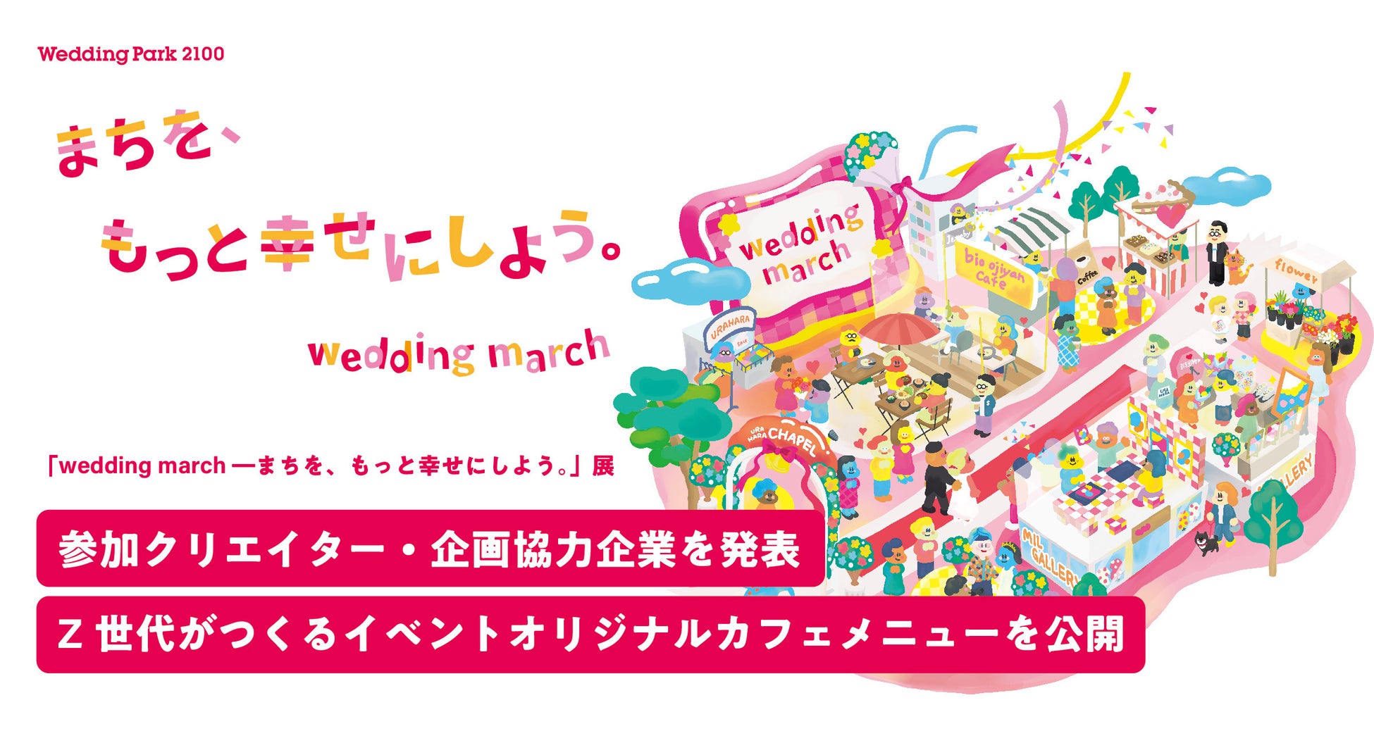 「wedding march ―まちを、もっと幸せにしよう。」展は、ウエディング企業・クリエイター・まちの人・ウエディングパークが共につくる、結婚・結婚式によってまちを幸せにするための取り組みです。