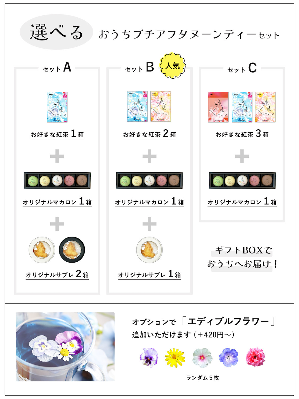 - セットA:お好きな紅茶1箱+オリジナルマカロン1箱+オリジナルサブレ2箱